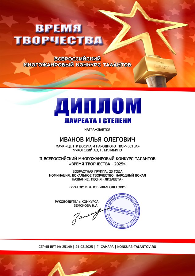Солист Дворца культуры Илья Иванов награжден дипломом Лауреата 1 степени Всероссийского многожанрового конкурса талантов «Время творчества- 2025».