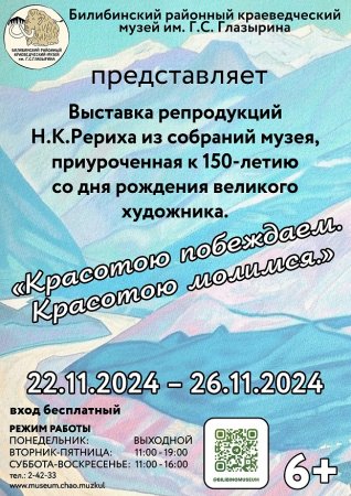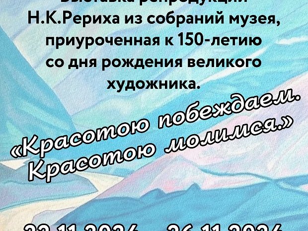 22 ноября в Билибинском районном краеведческом музее открылась выставка репродукций из фондов музея «Красотою побеждаем. Красотою молимся», посвященная 150-летию со дня рождения великого русского художника, писателя, археолога, философа, путешественника и общественного деятеля Николая Константиновича Рериха.