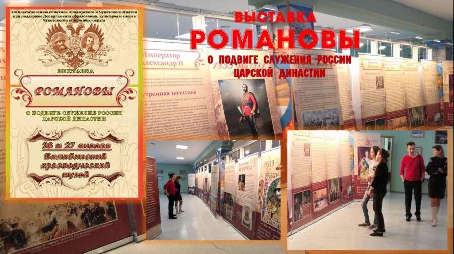 По благословению епископа Анадырского и Чукотского Ипатия при поддержке Департамента образования, культуры и спорта Чукотского автономного округа, 26 и 27 января в Билибинском краеведческом музее имени Г.С. Глазырина прошла выставка «Романовы» «Подвиг служения России царской династии Романовых».