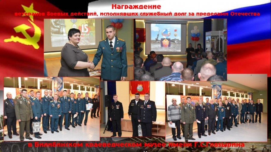 Эта встреча ознаменована тем, что ровно 30 лет назад, 15 февраля 1989 года генерал-лейтенант Борис Громов, стал последним советским военнослужащим, переступившим по Мосту Дружбы границу двух стран. Военными конфликтами, в которых принимали участие советские и российские военные, были войны в Корее и Въетнаме, Сирии и Египте, Мозамбике и Анголе, Югославии… Минутой молчания все гости почтили память воинов - интернационалистов, в разное время принимавших участие в локальных войнах, «горячих точках», но не вернувшихся домой. В нашем городе живут и работают участники боевых действий в Афганистане, в Югославии, в Чеченской Республики, на территории Северо - Кавказского региона и Южной Осетии. Глава муниципального образования городское поселение Билибино, Кожевникова Ольга Сергеевна, выступила с торжественной речью ко всем присутствующим и вручила Почетные Грамоты… Благодарности Совета Депутатов Билибинского муниципального района вручила Председатель Совета депутатов, Левашко Надежда Александровна. Слова благодарности воинам – интернационалистам выразили командир войсковой части 3537, капитан, Тобоков Ренат Григорьевич и Председатель Совета ветеранов военной службы Билибинского района Антонов Павел Валентинович. Далее награждение проводили военный комиссар Билибинского района Чукотского автономного округа Колесников Дмитрий Алексеевич и ветеран Афганистана, председатель совета Чукотского окружного отделения Всероссийской общественной организации ветеранов «БОЕВОЕ БРАТСТВО» Крылов Юрий Николаевич. Вручались: - Благодарности и ценные подарки от военного комиссариата Билибинского района; - Грамоты «Боевое братство»; - Памятные медали «30 лет вывода войск и Афганистана»; - Медали «Участнику миротворческой операции»; - Медали «Ветеран боевых действий»; - Медали «За службу на Кавказе»; - Медаль «Михаил Калашников»; -Медали «За ратную доблесть». В заключении вечера, сотрудники музея поздравили всех присутствующих с наступающим праздником Днем защитника Отечества и пожелали здоровья, успехов, благополучия во всем. Гости мероприятия были приглашены во второй зал на выставку, посвящённую Дню памяти воинам-интернационалистам.