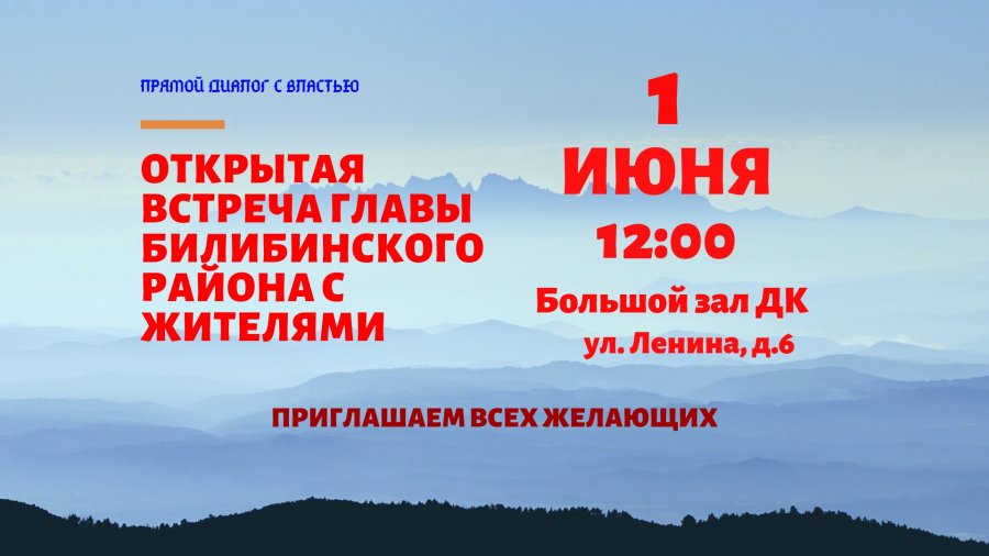 В субботу, 1 июня в 12:00 в большом зале Дворца Культуры (ул. Ленина, 6) состоится открытая встреча Главы Билибинского района Е.З. Сафонова с жителями.