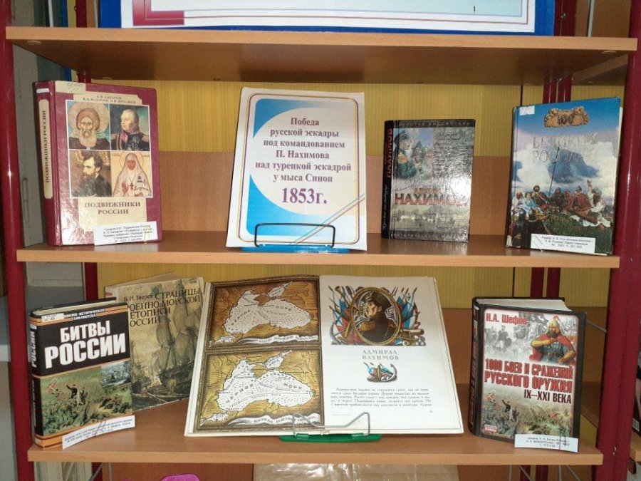 Центральная библиотека продолжает обновлять цикл книжных выставок «Дни воинской славы России». Ноябрь ознаменован Днем победы русской эскадры под командованием П.С. Нахимова над турецкой эскадрой у мыса Синоп (1853).