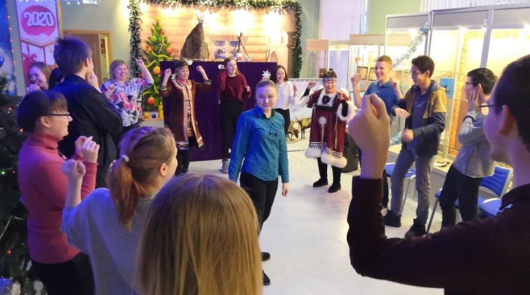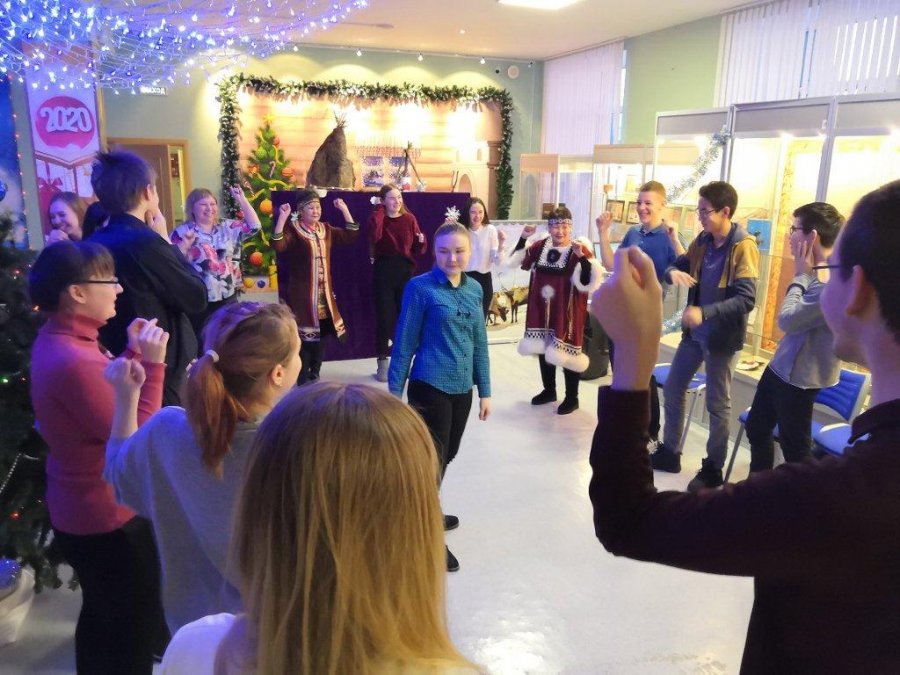 Праздник продолжился во втором зале музея, где всех ждала красивая, нарядная ёлка и кукольный театр с постановкой сказки «О ленивом брате», которую подготовили и играли чукотские волонтёры (Дъильькэв Людмила, Тынэнныы Любвь, Попкова Мария), они же подготовили викторину о значимых событиях округа, района и научили молодежь танцевать чукотские национальные танцы .