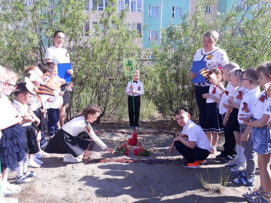 К сожалению, в современных условиях ребятам нельзя совершать экскурсии за пределы детского сада, но дошкольники детского сада «Сказка» творчески подошли к проекту: на прилегающей территории, в «зеленом уголке», было решено создать «Островок» из природных материалов. Воспитатели помогли собрать камни и, утвердив придуманный эскиз композиции, дошкольники приступили к творческому процессу, раскрашиванию природного материала в золотой цвет. Дружно прошел процесс создания мемориала в форме пятиконечной звезды, разноцветные свечи сымитировали огонь.