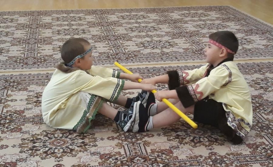 10 августа для старших дошкольников организован праздник. Ребятам в начале праздника была представлена презентация о малочисленных народах Сибири, Севера и Дальнего Востока. Затем, под пение воспитателя, девочки исполнили эвенский танец «Хозяюшка». Перед соревнованиями ребята показали, какую считалку на эвенском языке можно использовать для деления на команды. Конечно ни один национальный праздник коренных народов не обходится без состязаний. И наши ребята соревновались в перетягивании палки вдвоём и в команде. Задания весёлых стартов тоже соответствовали тематике праздника. Быстрая и весёлая подвижная игра «Охотники и куропатки» понравилась всем ребятам. В заключение праздника ребята рассматривали картинки с изображением представителей коренных народов в национальных костюмах, закрепляя полученные знания.