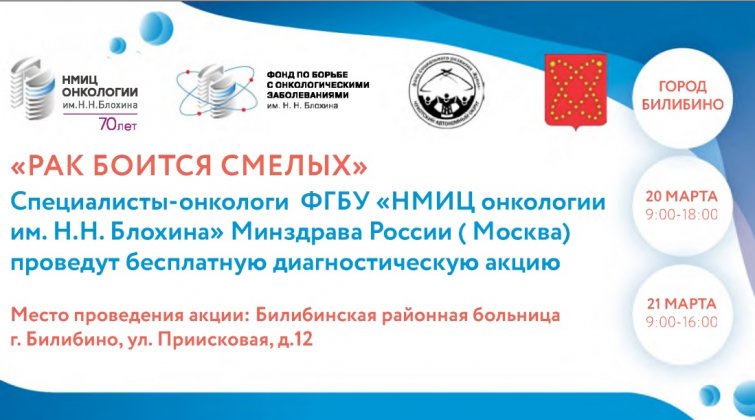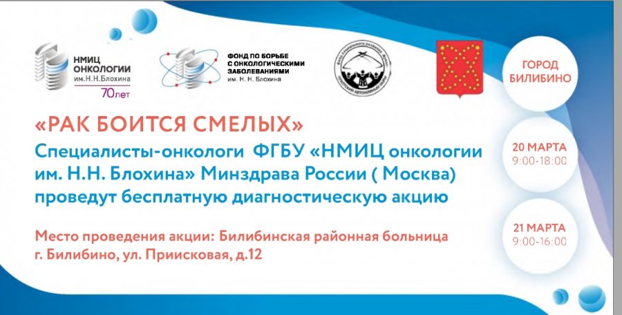 Некоммерческая организация «Фонд социального развития «Купол» и Некоммерческая организация «Фонд по борьбе с онкологическими заболеваниями имени Н.Н. Блохина» реализуют совместный проект «Рак боится смелых!». Проект направлен на первичную профилактику онкологических заболеваний на территории Билибинского и Чаунского района Чукотского АО. Группа волонтеров –медиков  - профессиональные медики – сотрудники ФГБУ «НМИЦ онкологии им. Н.Н. Блохина» Минздрава России проведут медицинские осмотры групп риска населения Билибинского и Чаунского районов в период с 16 по 22 марта 2021 г.
