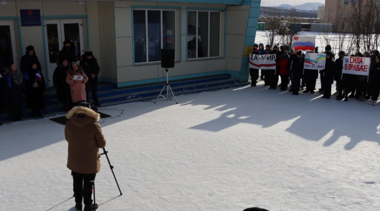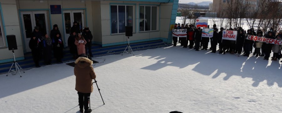 Массовая акция в поддержку России прошла в субботу, 5 марта 2022 года, в Билибино. В митинге приняли участие около 200 человек.