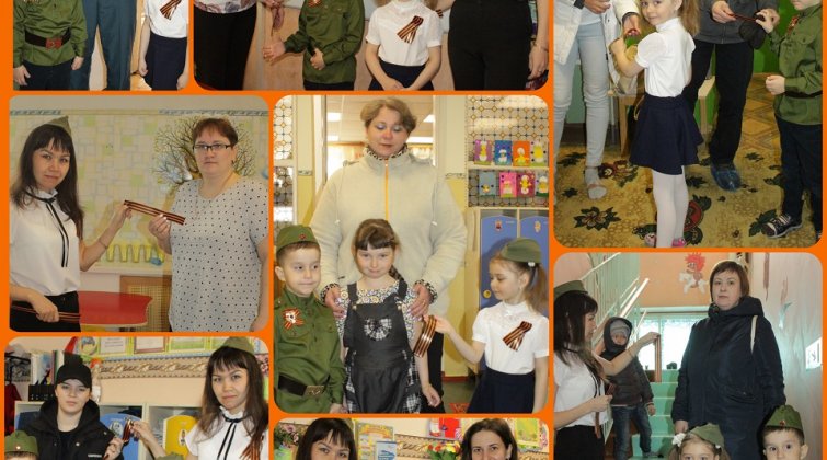В возрастных группах и коридорах детского сада педагоги и дети во время утреннего приема торжественно вручали родителям (законным представителям) воспитанников и сотрудникам детского сада георгиевские ленточки – главный символ дня Победы в Великой Отечественной войне как знак вечной признательности ветеранам, освободившим мир от фашизма.