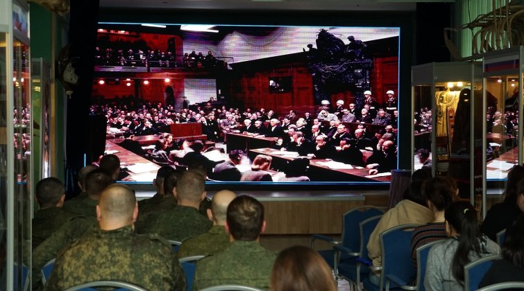 18 ноября в Билибинском краеведческом музее состоялось мероприятие «Ни давности, ни забвения- Нюрнбергский процесс», на котором присутствовали военнослужащие воинской части №35/37 и студенты Чукотского северо-западного техникума города Билибино. Сотрудники музея рассказали о самом длительном из всех процессов над военными преступниками – Нюрнбергском процессе. Который длился девять месяцев. На скамье подсудимых оказалась почти вся правящая верхушка Третьего рейха – высшие военные и государственные деятели, дипломаты, крупные банкиры и промышленники. Многочисленные преступления нацистов и их пособников, выявленные и обнародованные в ходе Нюрнбергского процесса, воистину поражают воображение. Все, что можно было изобрести запредельно жестокого, антигуманного и античеловеческого, было включено в арсенал фашистов. Нюрнбергский процесс стал историческим событием, прежде всего, как торжество закона перед нацистским беззаконием. Он разоблачил человеконенавистническую сущность германского нацизма, его план уничтожения целых государств и народов, его запредельную бесчеловечность и жестокость, крайнюю опасность нацизма и фашизма для всего человечества. Далее было предоставлено слово офицеру Воинской части 35/37 лейтенанту Беспалову Егору Александровичу, который сказал, что, к сожалению, многое из идеологии нацистов сейчас на Украине вновь пытаются поставить на вооружение. Рассказал, что военнослужащие их части наравне со всей страной участвуют в миротворческой операции, защищают честь нашей страны и спасают весь мир от современного фашизма. В завершении мероприятия был показан военно-патриотический видеоклип «Своих не бросаем – группа ПослеZавтра». Также, военнослужащим и студентам техникума была представлена фотодокументальная выставка, подготовленная сотрудниками музея, «Суды истории – Нюрнбергский процесс».