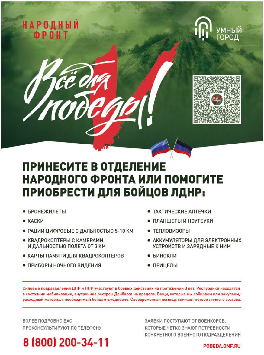 - Сбор средств на закупку квадрокоптеров, тепловизоров, средств связи, бронежилетов, защитных шлемов, генераторов, компьютерной техники, индивидуальных тактических аптечек, мягких носилок, спальных мешков, рюкзаков, средств обогрева, комплектов вещей, маскировочных сетей для нового подразделения 2-го гвардейского Луганско-Северодонецкого армейского корпуса.