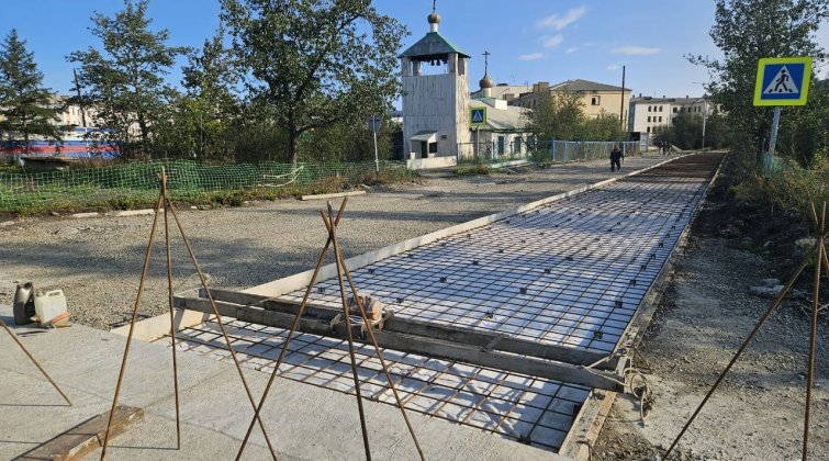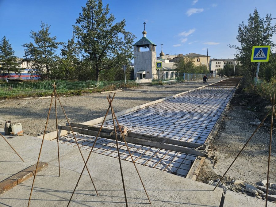 Со стороны техникума в сторону Октябрьской идет строительство тротуарной дорожки. Возле Кулинарии и Ярара ступеньки обустроили травмобезопасным покрытием.