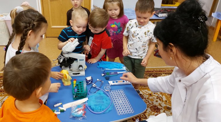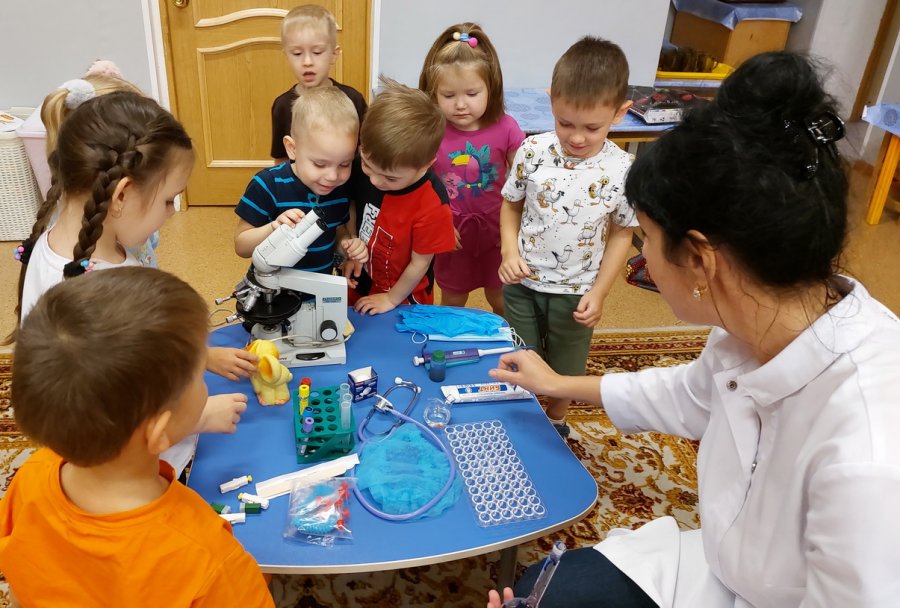 Воспитание ценностного отношения к здоровью – одна из важнейших задач дошкольной ступени образования. Для формирования мотивации к здоровому образу жизни, необходимо эмоционально положительное отношение, интерес к правилам здоровье сберегающего и безопасного поведения. День здоровья – форма организации образовательной, воспитательной, здоровье сберегающей деятельности, вызывающая эмоциональный отклик, как у детей, так и у взрослых. Проведение подобного дня способствует укреплению физического, психического здоровья, формированию ценностного отношения к здоровому образу жизни у дошкольников. После тихого часа с пожеланиями здоровья и веселой музыкой воспитатель подняла детей и провела с ними «Веселую зарядку», где они получили заряд бодрости и отличного настроения. День здоровья – это не просто часть воспитательной работы, но и встреча с интересным человеком. Так, например, в средние группы пришел гость из поликлиники, фельдшер – лаборант ГБУЗЧОБ филиал БРБ Смирнова Оксана Валерьевна. Которая, рассказал ребятам о своей профессии, чем она занимается на работе. Медицинский работник принесла с собой инструменты, атрибуты которые ей необходимы для работы в лаборатории. Особенно ребятам понравился микроскоп, не остался без внимания планшет с колбами и фонендоскоп. Много интересных терминов воспитанники узнали в ходе познавательной беседы. Дети были в восторге от «Дня здоровья», получили заряд бодрости и хорошего настроения, много знаний, а потом еще долго и с теплом вспоминали встречу с медиком и желали друг другу здоровья.