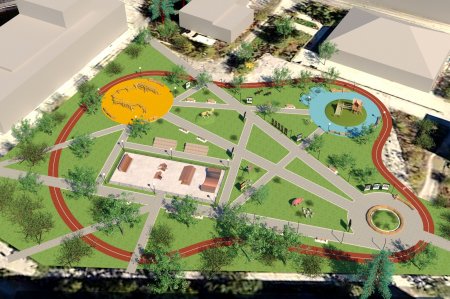 Общественная зона запланирована для различных возрастных групп населения. Установлены игровые и спортивные комплексы. По периметру участка располагается велодорожка. Основание под всеми элементами выполнено из травмобезопасного покрытия. В июне текущего года смонтировано и введено в эксплуатацию оборудование для скейт-парка.