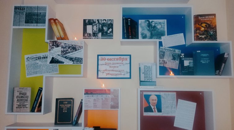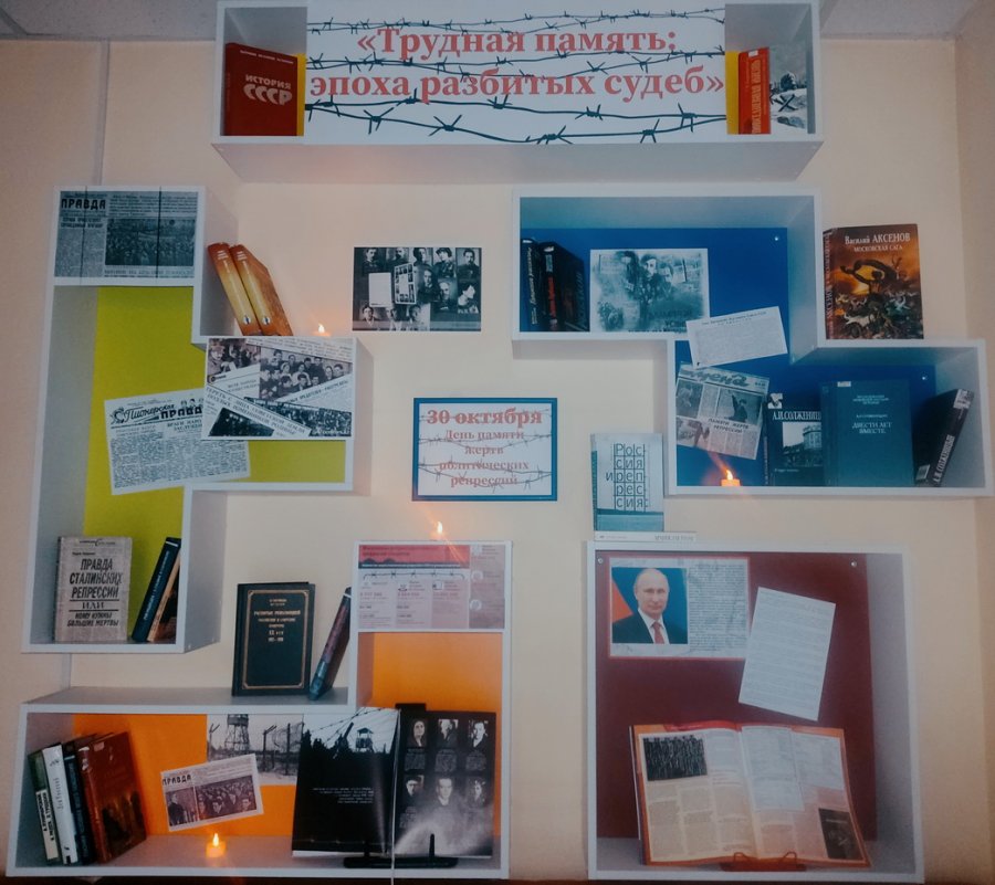 В преддверии знаменательной даты, в холле библиотеки организован литературно-выставочный проектдля посетителей«Трудная память: эпоха разбитых судеб».Читателям представлены вырезки и статьи из газет СССР, воспоминания и записи людей, которые были сосланы в лагеря, ссылки, специальные поселения. Основой выставки является историческая литература, документальная хроника политических расправ с фото сопровождением, а также художественная литература, позволяющая раскрыть истории тех, кто был подвергнут политическим репрессиям за свои убеждения по национальным, социальным и другим признакам и стал жертвой произвола тоталитарного государства.