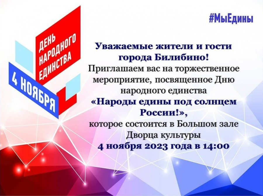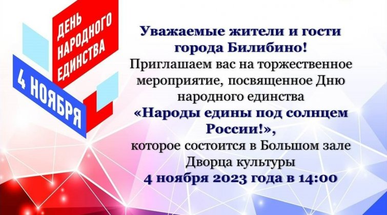 4 ноября 2023 года в 14:00 в большом зале Дворца культуры состоится праздничный концерт «Народы едины под солнцем России!», посвященный Дню народного Единства.