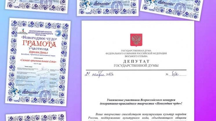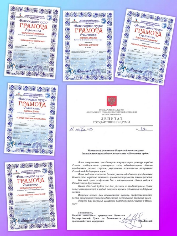 В онлайн формате проходил всероссийский конкурс декоративно-прикладного творчества «Новогоднее чудо». Проект реализовался при поддержке Президентского фонда культурных инициатив и проводился при информационной поддержке Федерального агентства «Россотрудничество». В конкурсе приняли участие ребята из кружкового формирования «Мир творчества» Дворца культуры. Руководитель кружка отправил организаторам фотографии работ, выполненные в разных техниках декоративно-прикладного творчества, сделанные своими руками. Каждый участник получил грамоту участника. Приятным сюрпризом стало поздравление с наступающим Новым годом от Деда Мороза из Великого Устюга и первого заместителя председателя Комитета Государственной Думы по безопасности и противодействию коррупции Андрея Константиновича Лугового. «Ваше творчество способствует популяризации культур народов России, поддержанию культурного кода, объединяющего общими традициями разные страны, укреплению позитивного восприятия Российской Федерации в мире»– говорит А. К. Луговой. На участие в конкурсе поступило 12 128 заявок, это 19 923 фотографии работ. 850 участников из-за рубежа: Беларуси, Казахстана, Молдовы, Узбекистана, Туркменистана, Таджикистана, Армении, КНР, Испании, Гватемалы, Венгрии, Великобритании.