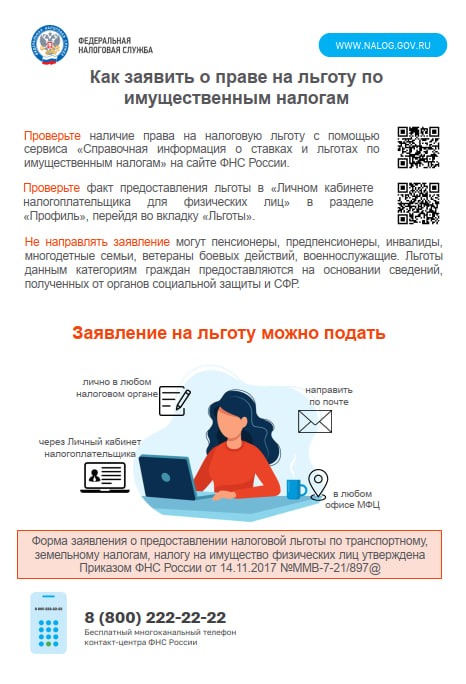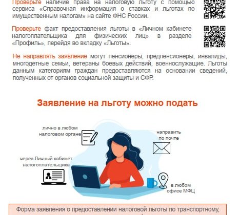 Если налогоплательщик имеет право на льготу, но информация о ней не отражена в Личном кабинете, налоговая служба рекомендует самостоятельно обратиться в налоговый орган и представить заявление по утвержденной форме (приказ ФНС России от 14.11.2017 №ММВ-7-21/897@). Сделать это можно лично или через уполномоченного представителя, с помощью «Личного кабинета налогоплательщика для физических лиц», через МФЦ, направить по почте.