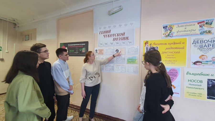 К юбилею поэта для обучающихся СОШ г. Билибино школьный библиотекарь оформила выставку-стенд под названием «ГЕНИЙ ЧУКОТСКОЙ ПОЭЗИИ». Проведены первые тематические классные часы, посвященные гениальному чукотскому поэту. Ребята с интересом знакомятся с биографией и творчеством Виктора Григорьевича.
