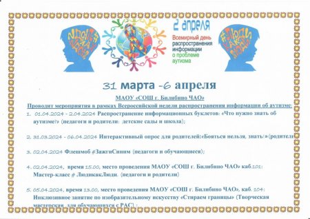 В МАОУ «СОШ г. Билибино ЧАО» пройдут мероприятия в рамках Всероссийской недели распространения информации об аутизме.