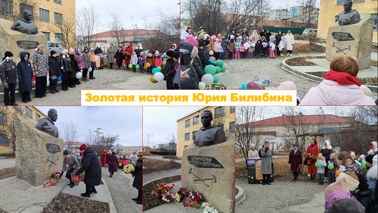 У нас, на Чукотке, в суровом краю, Есть маленький город, в котором живу. Он имя Билибина гордо несёт, А с ним его Славу и Честь и Почёт! Ежегодно, 19 мая, билибинцы отмечают день рождения Юрия Александровича Билибина - учёного, геолога, исследователя, имя которого прочно связано с Северо-восточной окраиной нашей Родины – Колымой, человека, которого чтут и помнят многие годы. В преддверии празднования 123-его дня рождения Ю.А.Билибина, 17 мая, в сквере у памятника первооткрывателю месторождений золота, который в 1928 году возглавил Колымскую экспедицию, результатом которой стало открытие и организация одного из главных «золотых» цехов нашей страны, состоялось торжественное мероприятие «Золотая история Юрия Билибина». В мероприятии приняли участие представители Администрации города, воспитанники дошкольных учреждений, учащиеся начальной школы, студенты Чукотского северо-западного техникума, жители и гости города. Ведущие рассказали о великих заслугах Юрия Александровича в освоении природных богатств нашей Родины, имя которого широко известно среди российских и зарубежных геологов, изучающих месторождения полезных ископаемых. Его имя звучит навсегда в названии Билибинского района, города Билибино, многих улиц городов и посёлков Магаданской области, вулкана в бассейне Большого Анюя, горного хребта в Якутии, в минерале Билибинит. Много было сказано слов о Ю.А.Билибине, талантливом человеке, которому судьбой была уготована яркая, сложная, удивительная и, к сожалению, короткая жизнь. Гости торжественно возложили цветы в дань памяти об этом выдающемся человеке.
