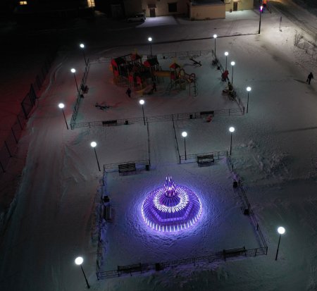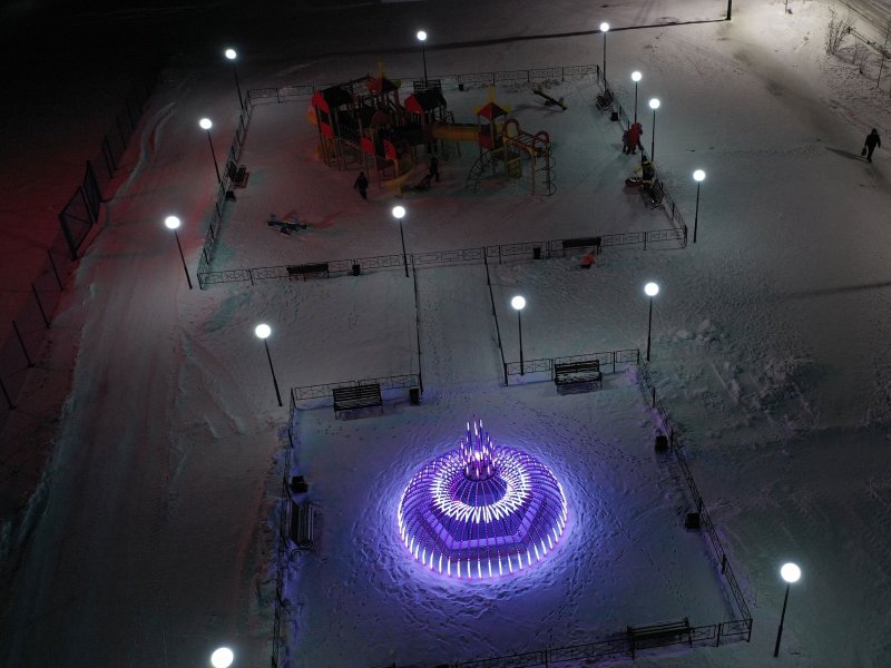 В зимнее время на фонтан устанавливается каркасная конструкция с гибкими и прочными лентами, на которых размещены светодиодные лампы.