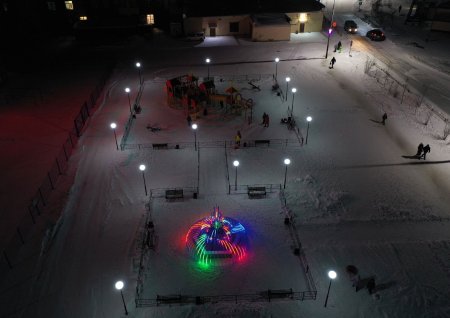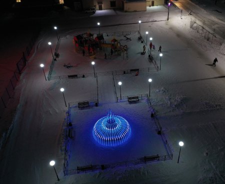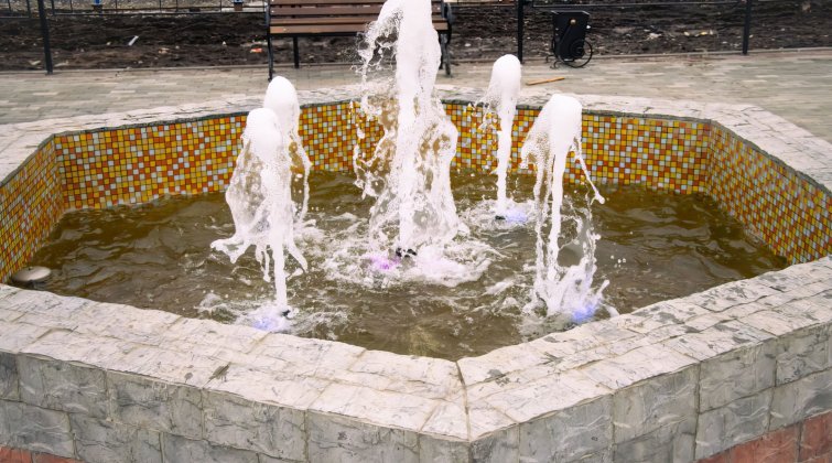 Общественное пространство с водным сооружением находится на месте снесенного дома по улице Курчатова. Рядом с фонтаном - благоустроенная детская площадка, тротуар и лавочки для отдыха.