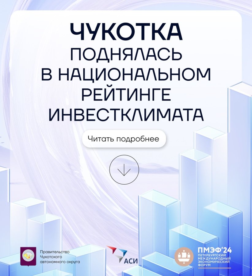 В Национальном рейтинге состояния инвестиционного климата Чукотка поднялась из 29 в 23 группу. Это означает рост на 15 позиций. Чукотка - в лидерах по: -скорости выдачи разрешений на ввод объектов в эксплуатацию. Время выдачи удалось сократить в 2 раза - скорости регистрации прав собственности (4 дня) -консультационным и образовательным услугам для малого и среднего бизнеса -доступности кредитных ресурсов -налоговым льготам и региональным субсидиям Рейтинг формируется на основании мнения предпринимателей о работе управленческой команды региона. Национальный рейтинг состояния инвестклимата этого года - не только оценка работы Правительства региона. Это - сигнал для инвесторов: на Чукотке уникальные условия для ведения бизнеса. Работа в этом направлении ведется, в том числе, в рамках Национального проекта "Малое и среднее предпринимательство и поддержка индивидуальной предпринимательской инициативы".