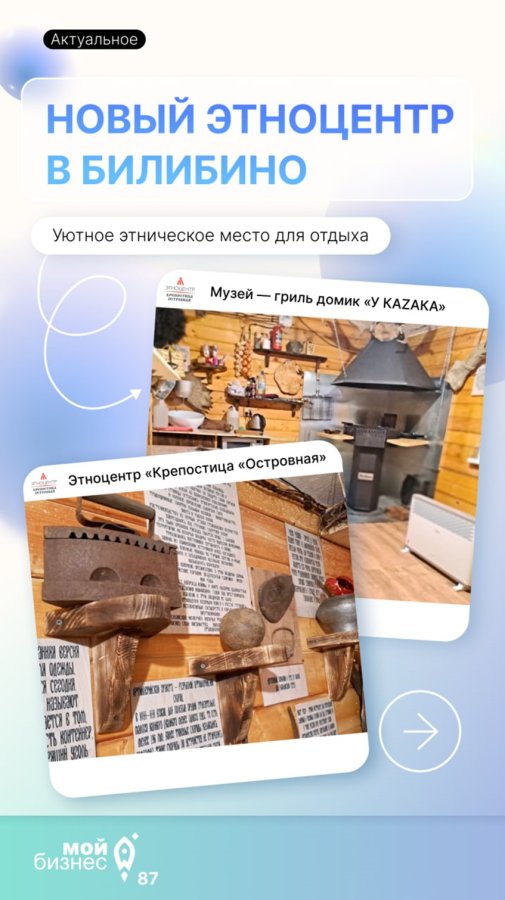 В Билибино начал работу Этноцентр «Крепостица «Островная». Проект посвящён истории переселенцев русских и казаков, которые пару веков назад поставили в районе села Островного, небольшую крепостицу. Там проходила знаменитая Анюйская ярмарка. В Этноцентре будет несколько зон отдыха, где гости могут познакомиться с культурой и историей места. Историей народов, населявших эти места, их бытом и традициями. В настоящее время Этноцентр оказывает услуги аренды интерактивного музея - гриль домика «У КАZАКА» . Завершается строительство ремесленной мастерской, в которой располагается кузница и уголок костореза. В планах строительство еще двух объектов отдыха и размещения гостей. Для реализации проекта предприниматель Александр Григорьев воспользовался мерами государственной поддержки направленной на развития бизнеса получив грант на "Старт" в рамках национального проекта поддержки малого и среднего предпринимательства. Бизнес план и документы на получение грантов были подготовлены Центром «Мой Бизнес». Теперь, магазин ЭТНОЦЕНТРА «КРЕПОСТИЦА «ОСТРОВНАЯ» представлен на торговой площадке «Сделано на Чукотке» (https://www.market87.ru/). Познакомиться с услугами и их стоимостью можно здесь. (https://www.market87.ru/vendor/grighoriev-74/) Стать одним из брендов платформы можно бесплатно, пройдя простую регистрацию по ссылке. (https://www.market87.ru/reg-vendor/) Подробную информацию можно получить по: телефону горячей линии 8-800-2010-800 (звонок бесплатный), электронной почте mail@fond87.ru адресу г. Анадырь, ул. Тевлянто, д.1, центр «Мой бизнес».