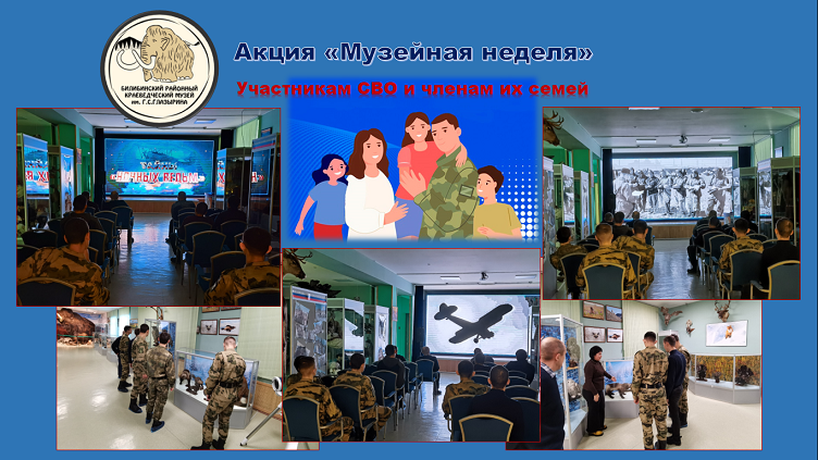 Билибинский краеведческий музей имени Г.С.Глазырина принял участие в акции «Музейная неделя», которая прошла в период с 19 по 27 октября, в ходе которой представили участникам СВО и членам их семей в кинозале выходного дня документальные фильмы «Тайны ночных ведьм», «Красная книга. Потомок мамонта» в рамках фестиваля «Правильное кино». Сотрудники представили вниманию экспозицию животного и растительного мира Билибинского района, провели экскурсию по залам музея.