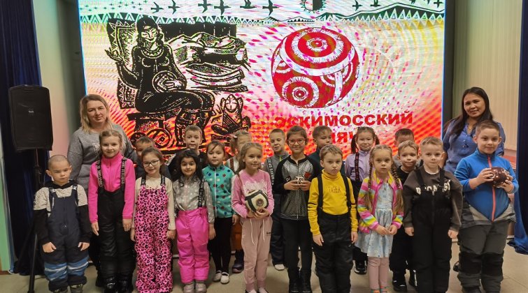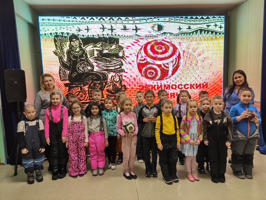 Для детей подготовительной группы детского сада «Алёнушка» 13 ноября в Билибинском краеведческом музее прошло лекционное мероприятие «Солнце на ладони» об эскимосском мяче. Сотрудники музея рассказали про эскимосский мяч, который считали оберегом, хранителем очага, исцелителем болезней. Об изначальной роли мяча – быть главным атрибутом на праздниках, связанных с ежегодным обновлением природы. Когда после долгой полярной ночи появлялось солнце, и с каждым днём поднималось всё выше над горизонтом, приветствовать его выходили все жители поселения. Ребята узнали о том, что мячи, которыми издавна любили играть чукчи и эскимосы, обычно шили из кожи и набивали оленьей шерстью. Они были разного размера. Береговые эскимосы шили мячи только с нерпы, использовали различные варианты выделки кожи. Пошив мяча – это создание сложной орнаментальной композиции. С древних времён эскимосский мяч был символом солнца, солнце – это кружки, нарисованные на его поверхности. Мяч обозначает небесную сферу вокруг Земли, является образом вселенной у коренных народов Чукотки. Игры и мячи были связаны с первобытной магией, имели ритуальное значение. В заключение мероприятия ребята отвечали на вопросы, играли с мячами и посмотрели мультипликационный фильм по мотивам эскимосских сказок «Про Ворона».