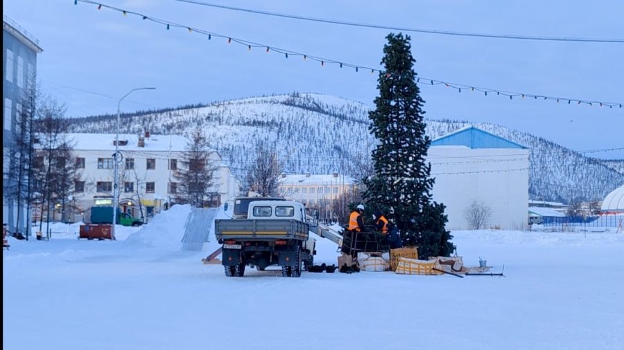В Билибино на центральной площади начали устанавливать новогоднюю ёлку