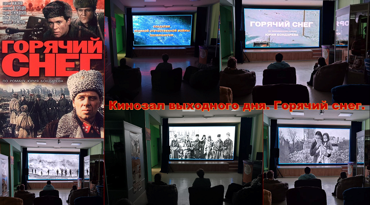 «И пробил час. Удар обрушен первый, – От Сталинграда пятится злодей. И ахнул мир, узнав, что значит верность, Что значит ярость верящих людей» (О.Бергольц «Сталинграду») 1 и 2 февраля в музейном кинозале прошёл показ советского художественного фильма о войне «Горячий снег» по одноимённой книге писателя - Юрия Бондарева. Фильм рассказывает об одном из эпизодов героического сражения против фашистов на подступах к Сталинграду, в котором в полной мере проявилась стойкость и сила духа русских солдат, защищавших родную землю. Показ фильма приурочен к 82-й годовщине разгрома советскими войсками немецко-фашистских войск в Сталинградской битве. Зрители увидели события 1942 года под Сталинградом, куда на помощь окружённой армии фельдмаршала Паулюса движется несколько танковых дивизий под командованием генерала Манштейна. Советским артиллеристам поставлена задача не допустить воссоединения двух вражеских группировок, так как это может решить исход всей Сталинградской битвы. Русским солдатам нужно сделать всё возможное, чтобы остановить более двухсот немецких танков, даже если придётся заплатить самую высокую цену…