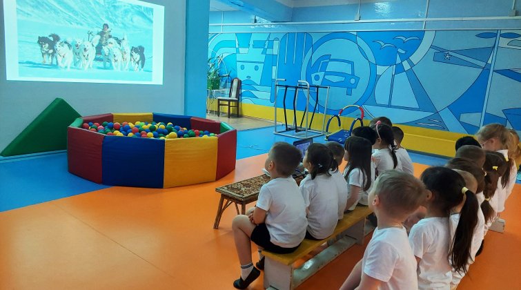 Ребята рассмотрели иллюстрации с изображением разных пород собак. Затем ребята увидели на полу «следы» собак и пошли по следам. Собачьи следы привели детей в спортивный зал, где они посмотрели презентацию о разных породах ездовых собак, узнали, что и в наше время их используют для перевозки грузов и людей, а также существует спортивная езда на собаках. Ездовые собаки отличаются невероятной физической выносливостью, неприхотливостью, способностью преодолевать огромные расстояния. В конце мероприятия дети поиграли в чукотскую подвижную игру «Каюр и собаки».
