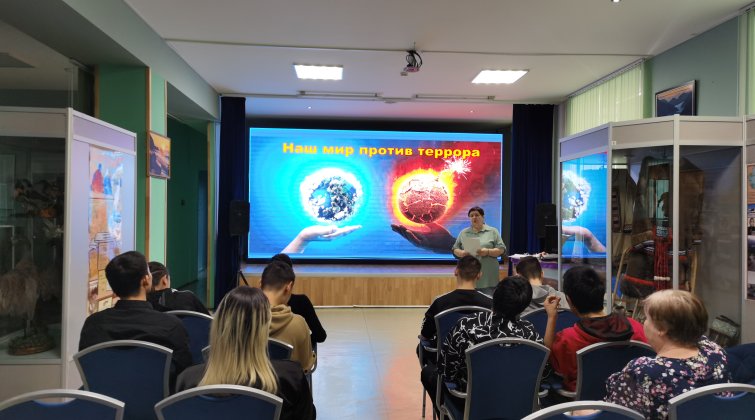 Терроризм – самое страшное деяние, которое совершается на земле. В результате терактов страдают ни в чём не повинные люди. Для достижения своих кровавых целей террористы готовы лишить жизни даже детей. Почти ежедневно в мире гибнут люди от рук националистов, членов запрещённых военных группировок, экстремистов, диверсантов и преступных бандформирований. Одна из важнейших задач воспитания подрастающего поколения и молодёжи – осведомлённость, умение правильно вести себя в сложившейся обстановке – «Предупреждён – значит вооружен!». 20 февраля в Билибинском краеведческом музее прошло мероприятие из цикла «Антитеррор» - «Наш мир против террора!». Научные сотрудники музея подготовили для студентов Чукотского северо – западного техникума презентацию, видеоролики и лекцию, рассказывающие о терроризме в современном мире. Ребята узнали о том, какие существуют правила поведения, если человек оказался в заложниках, попал в теракт, что делать, если оказался в центре экстремальных событий. В конце мероприятия был показан видеоролик на песню «Так хочется жить…».