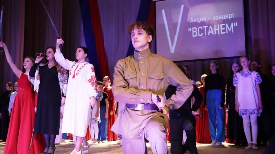 В рамках Года защитников Отечества и празднования 80-летия Победы в Великой Отечественной войне на сцене Дворца культуры состоялась акция – концерт «ВСТАНЕМ» в поддержку участников Специальной Военной Операции.