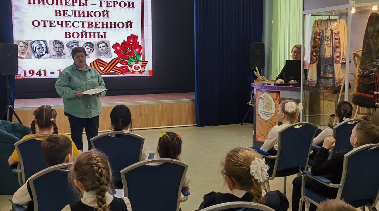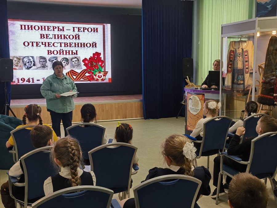 Великая Отечественная война стала страшным испытанием для нашей страны. Много трагических событий выпало на долю нашего народа. Трудными были долгие 1418 дней, которые отмечены боями и сражениями, потерями родных и близких. На защиту Родины встали все - от мала до велика. «Дети и война» – понятия несовместимые, но в трудную минуту даже детское сердце переполняется ненавистью к врагу, становится отважным и смелым. Много подвигов совершили маленькие воины Великой Отечественной войны. 7 мая в Билибинском краеведческом музее прошло мероприятие для второклассников начальной школы «Пионеры – герои Великой Отечественной войны», посвящённое 80-летию Великой Победы и Году защитника Отечества. Сотрудники музея подготовили презентацию и лекцию по теме. Ребята узнали о том, кто такие пионеры и как они боролись с фашистскими захватчиками, участвовали в партизанском движении, были разведчиками и подрывниками, доставляли ценные сведения для военных. Много трудностей выпало на их долю, многие не дожили до Победы, почти все юные герои получили правительственные награды, а некоторые - звание Герой Советского Союза. Ребятам была проведена экскурсия по большой музейной экспозиции «Великая поступь Победы», где они ознакомились с фотодокументальными выставками: «Города - Герои», «Маршалы Победы», «Медицина в годы Великой Отечественной войны», «Труженики тыла», «Ветераны Великой Отечественной войны». В заключение мероприятия был показан мультипликационный фильм «Жить!» (детям о Великой Отечественной войне).