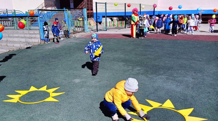 Появление клоунессы Веселинки вызвало у малышей радость и смех. На протяжении всего праздника Веселинка развлекала ребят своими веселыми играми. С большим удовольствием дети выкладывали лучики для солнышка, «собирали ягоды» для варенья, устроив соревнование между командами, играли в веселые словесные игры, правильно отвечая на вопросы, и даже научили Веселинку танцевать «Танец маленьких утят». В игре «Веселый бубен» малыши демонстрировали свои первичные танцевальные навыки.