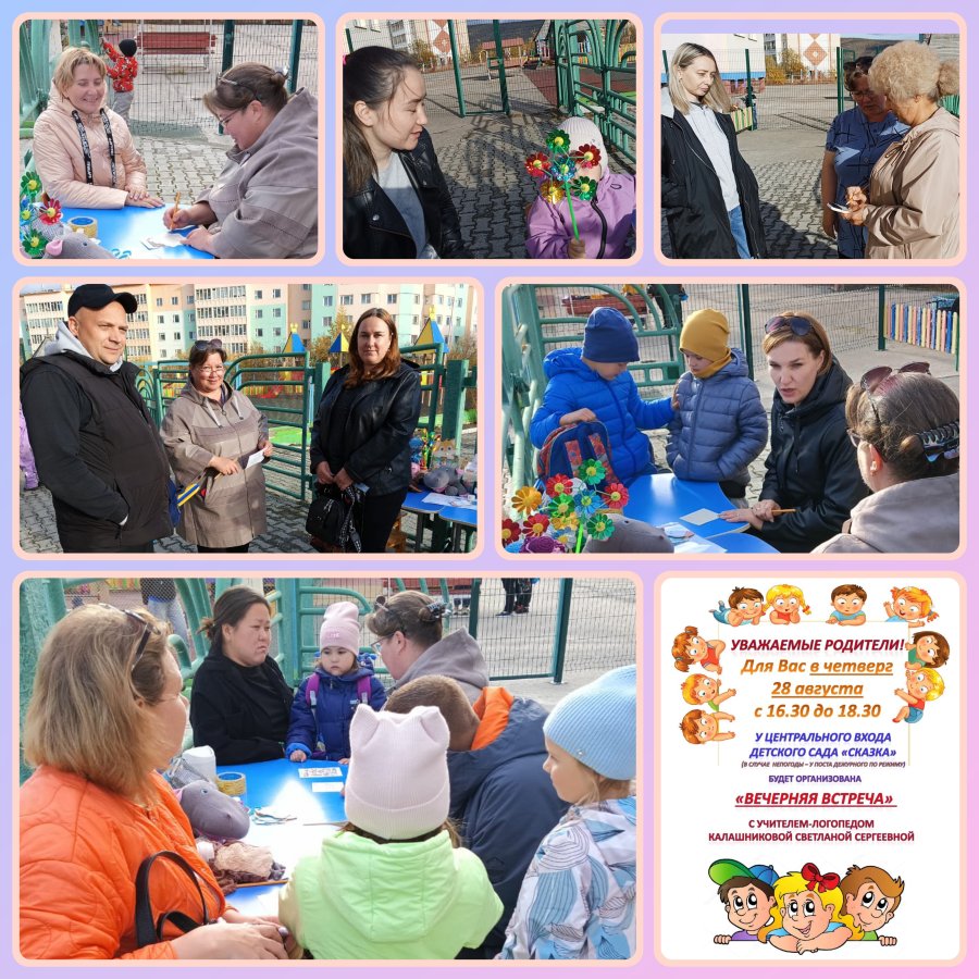 В четверг, 28 августа, с 16.30 до 18.30 у центрального входа детского сада «Сказка» для родителей образовательного учреждения была организована «Вечерняя встреча» с учителем-логопедом. При активном участии воспитателей постоянный поток родителей, начавшийся раньше и закончившийся позднее указанного времени, позволил осуществить главное – сблизить участников образовательного процесса. Из-за массовости обращений намеченные мероприятия вечера, предназначенные для малышей осуществились частично: кому-то удалось выполнить только полезную поделку для домашних занятий, кому-то ответить на вопросы экспресс-теста. Но фактически все малыши получили в подарок мини-игру, заинтересовались яркими пособиями для развития дыхания, артикуляции. Заинтересованные взрослые получили ответы на вопросы, каждому была дана информация по ситуации. Почти 95% обратившихся родителей, имеющих детей сензитивного возраста, планируют продолжить сотрудничество во благо своевременного развития и воспитания своих любимых ребят.