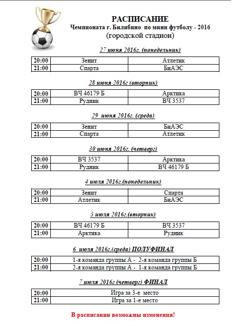 Расписание Чемпионата г. Билибино по мини футболу -2016